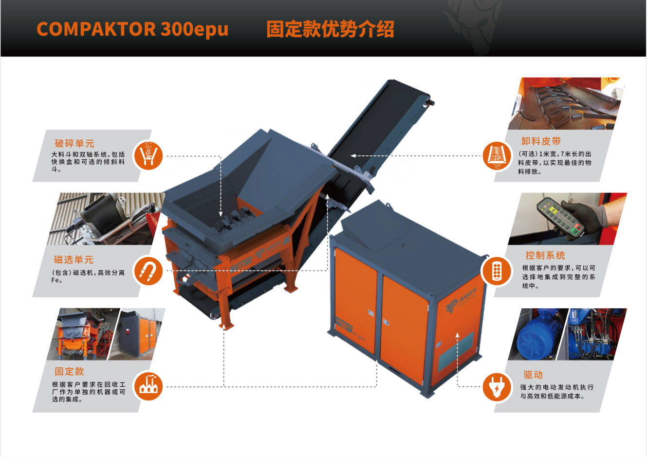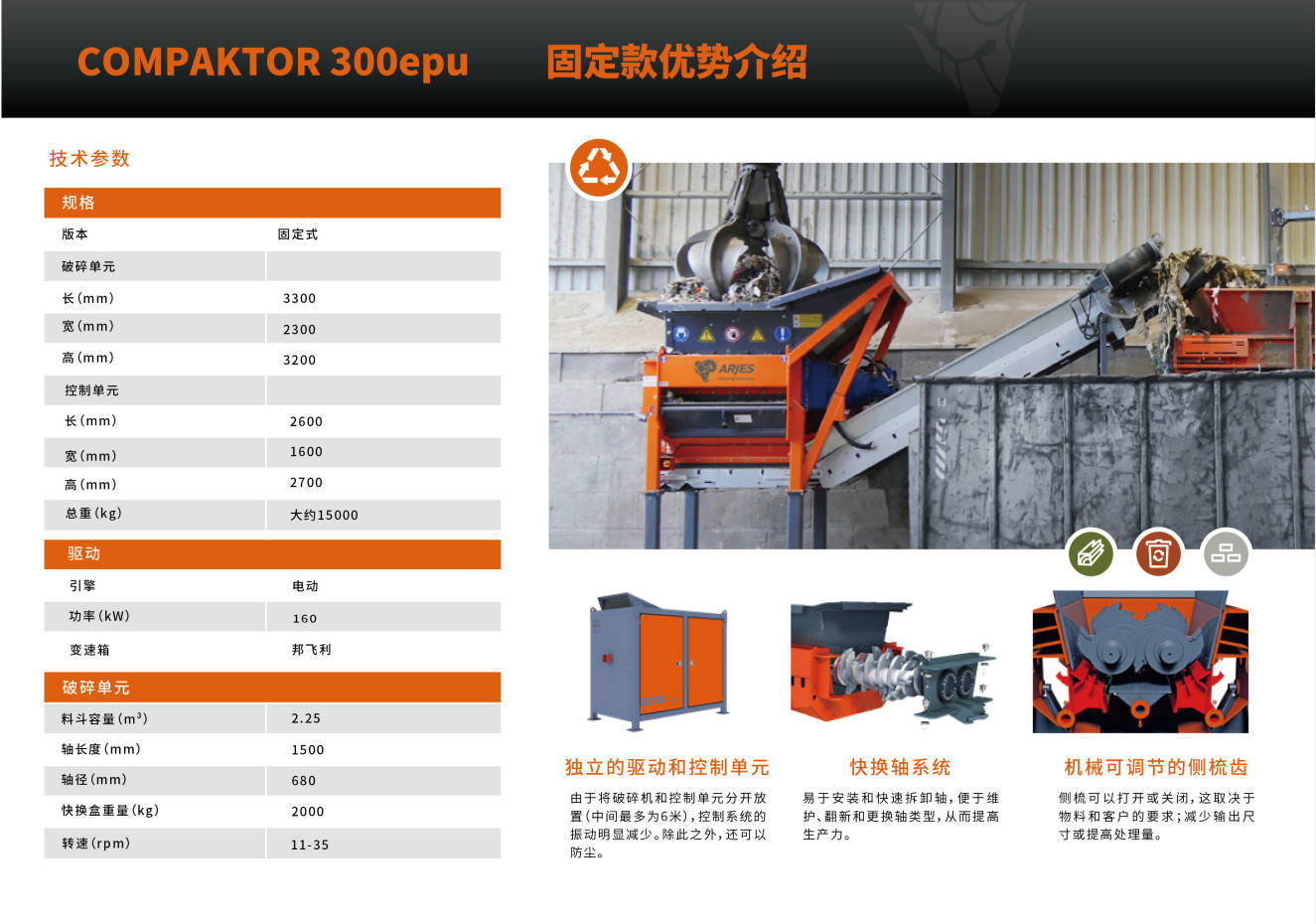 ARJES公司以其雙軸撕碎機而聞名,其產(chǎn)品具有超高的移動性能。ARJES COMPAKTOR300系列撕碎機是根據(jù)市場的具體需求設(shè)計并制造的固廢垃圾處理設(shè)備,可破碎各種堅硬的物料,例如瓦礫,混凝土等,以應(yīng)對國內(nèi)市場急需的環(huán)保型建筑垃圾循環(huán)利用設(shè)備。德國原裝的這款設(shè)備,可移動,可固定;功能強,能耗低,每小時可處理80噸左右的建筑垃圾,可有效地解決國內(nèi)目前所面臨的建筑垃圾處理的難題。