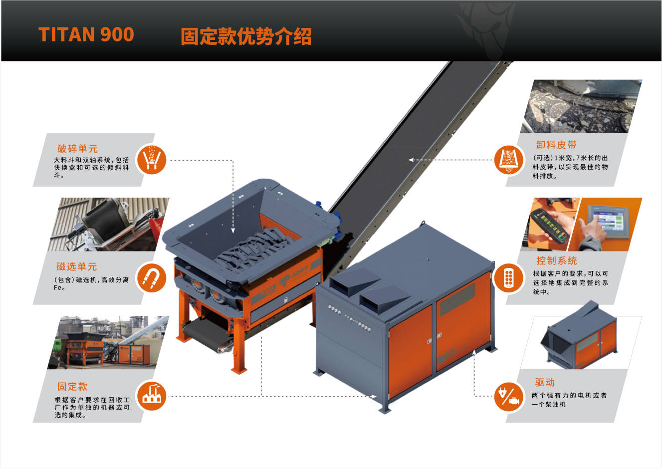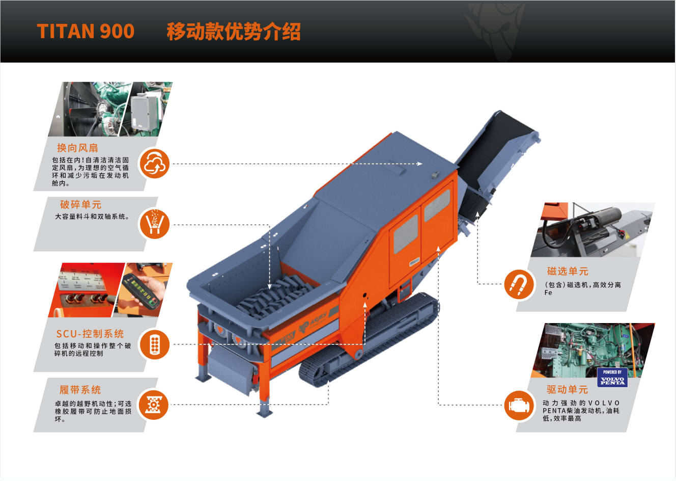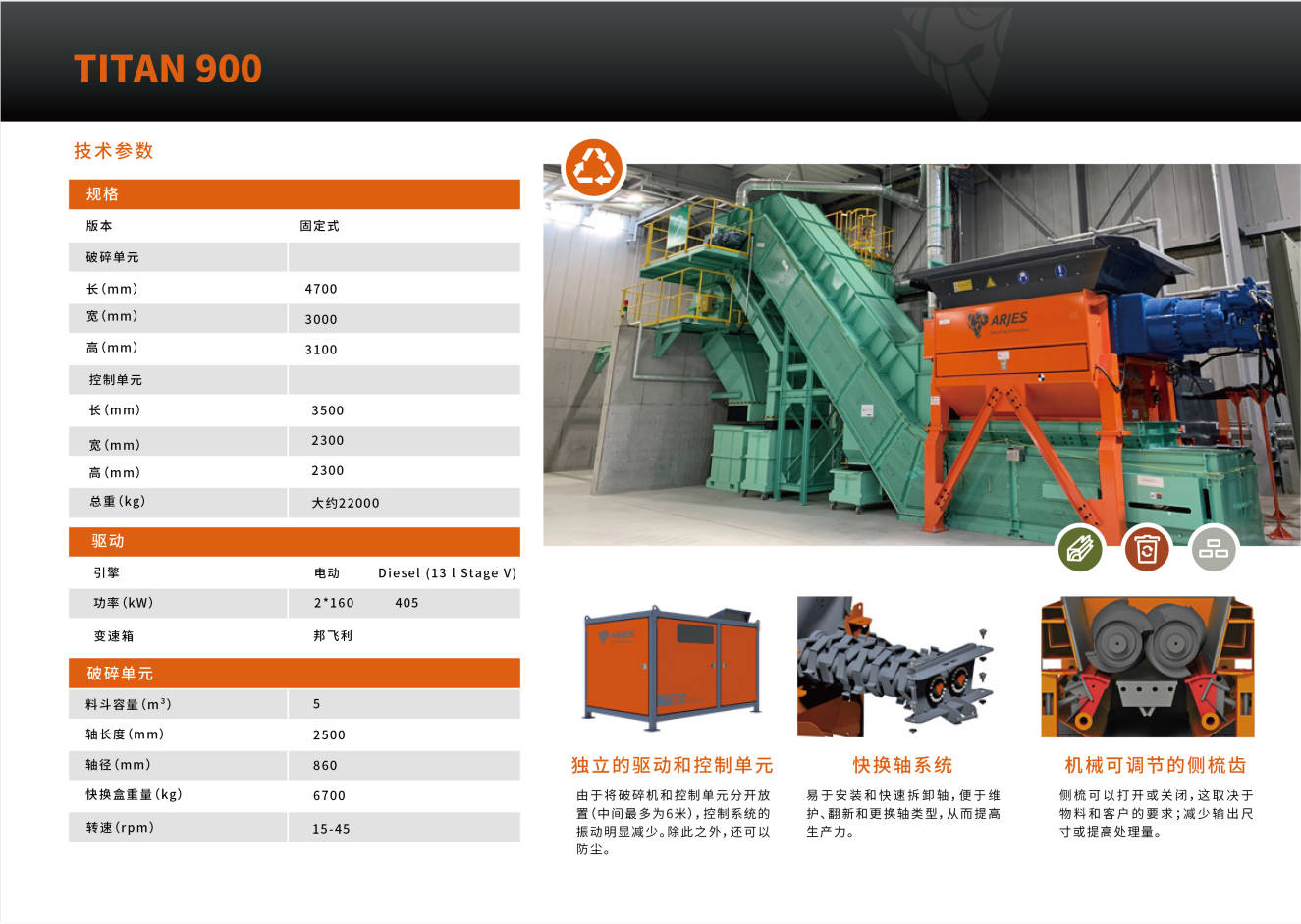 ARJES公司以其雙軸撕碎機而聞名,其產品具有超高的移動性能。ARJES TITAN 900 系列重型撕碎機是根據(jù)市場多場景應用需求設計并制造的固廢垃圾處理設備,可破碎各種堅硬的物料,例如瓦礫,混凝土等,以應對國內市場急需的環(huán)保型建筑垃圾循環(huán)利用設備。德國原裝的這款設備,可移動,可固定;功能強,能耗低,可處理大型輪胎、大件垃圾、建筑垃圾、漁網(wǎng)等多種廢棄物,適合高處理量的需求。