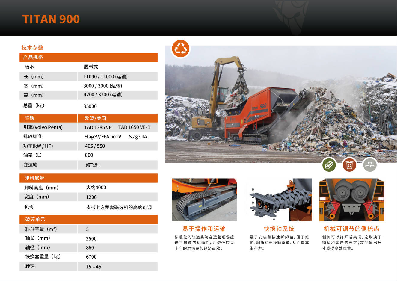 ARJES公司以其雙軸撕碎機而聞名,其產品具有超高的移動性能。ARJES TITAN 900 系列重型撕碎機是根據(jù)市場多場景應用需求設計并制造的固廢垃圾處理設備,可破碎各種堅硬的物料,例如瓦礫,混凝土等,以應對國內市場急需的環(huán)保型建筑垃圾循環(huán)利用設備。德國原裝的這款設備,可移動,可固定;功能強,能耗低,可處理大型輪胎、大件垃圾、建筑垃圾、漁網(wǎng)等多種廢棄物,適合高處理量的需求。
